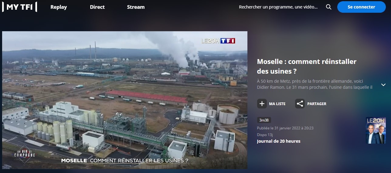 Reportage sur TF1 ici (à partir de 1m50s) : https://www.tf1.fr/tf1/jt-20h/videos/moselle-comment-reinstaller-des-usines-75267570.html